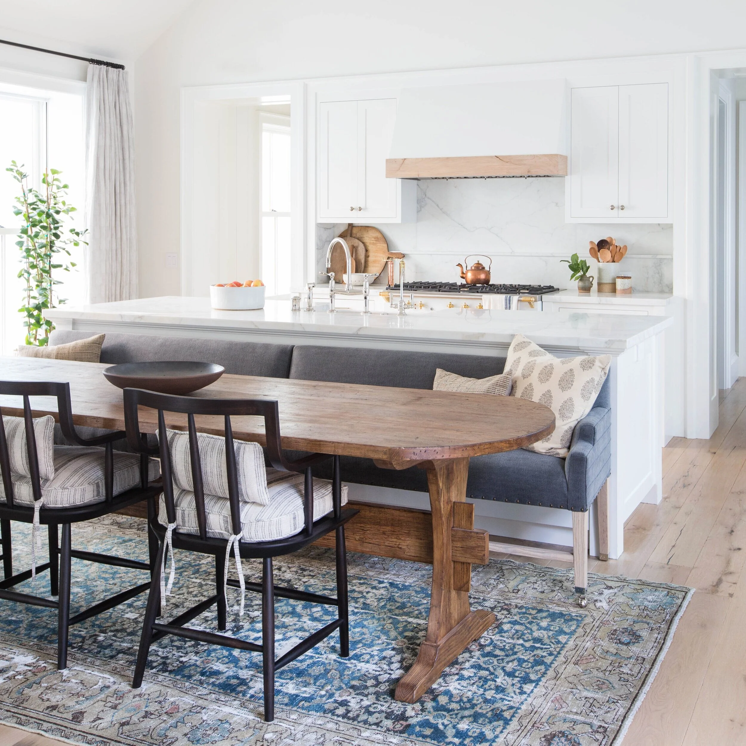 A small scale renovation where we left the beams, steel windows and brick from the bungalow’s original kitchen, redesigned the cabinetry, island, powder room and breakfast nook to feel timeless.